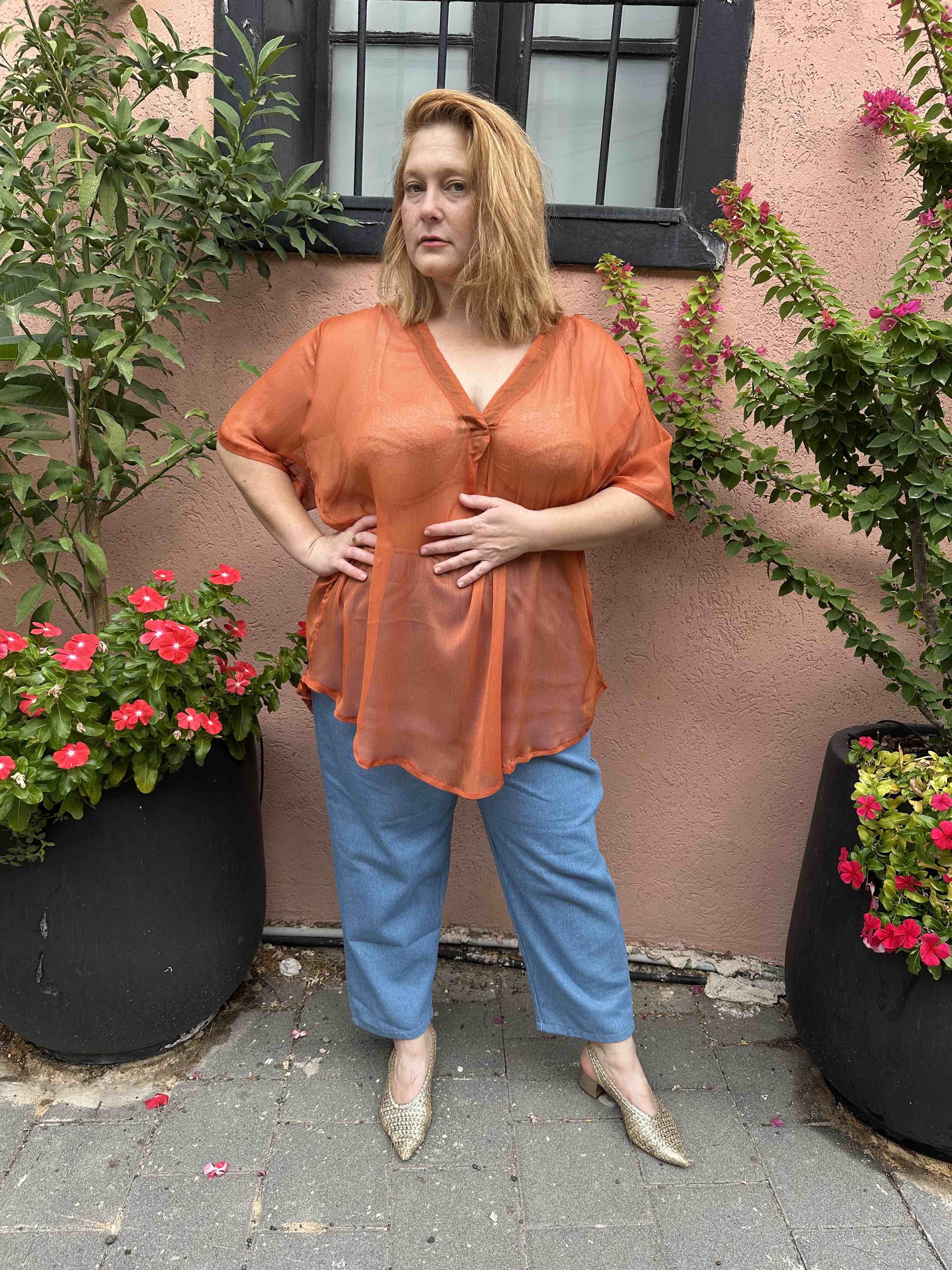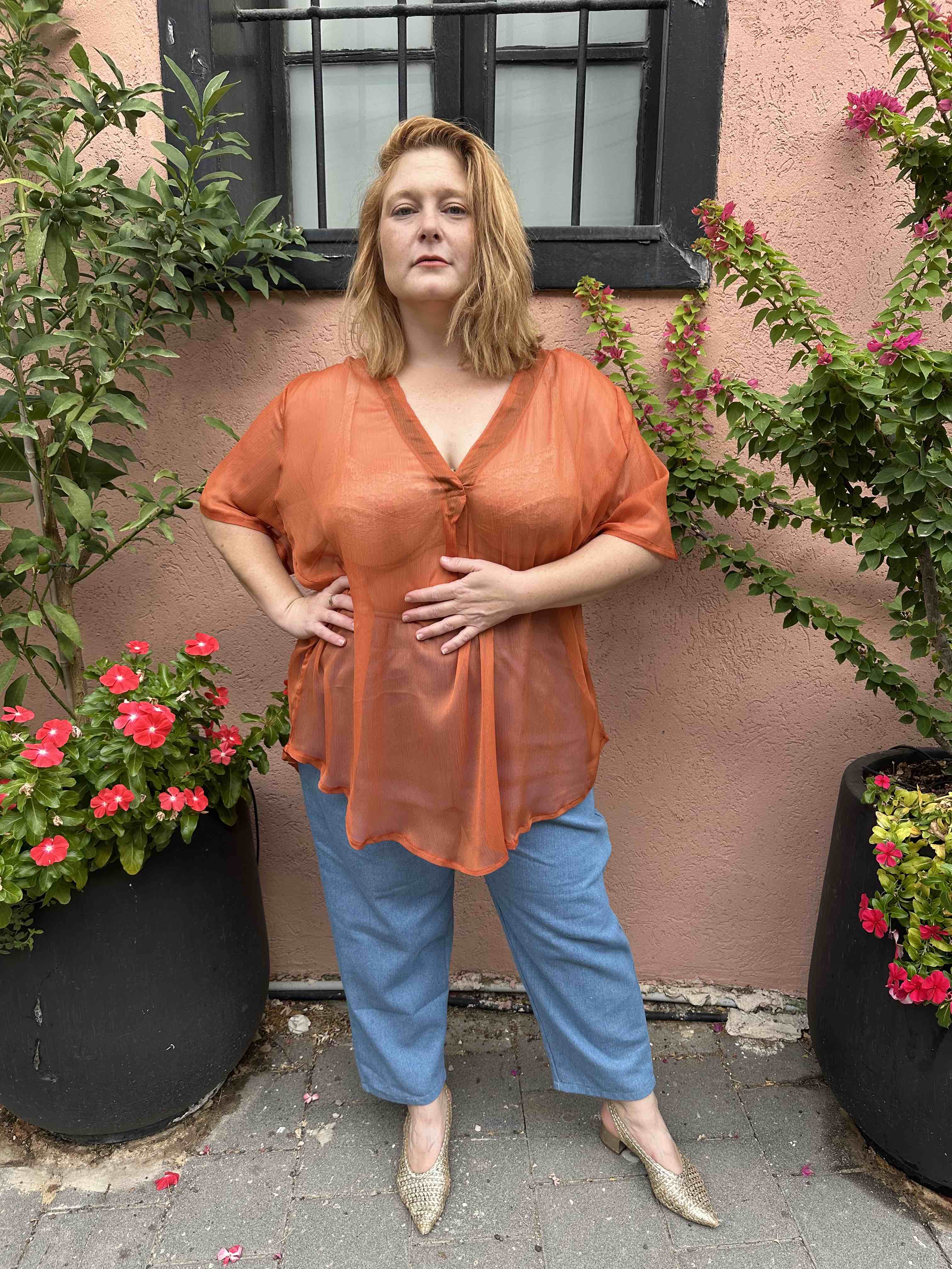 הדוגמנית בתמונת סטודיו לובשת מידה 44 וגובהה 1.60 מטר.