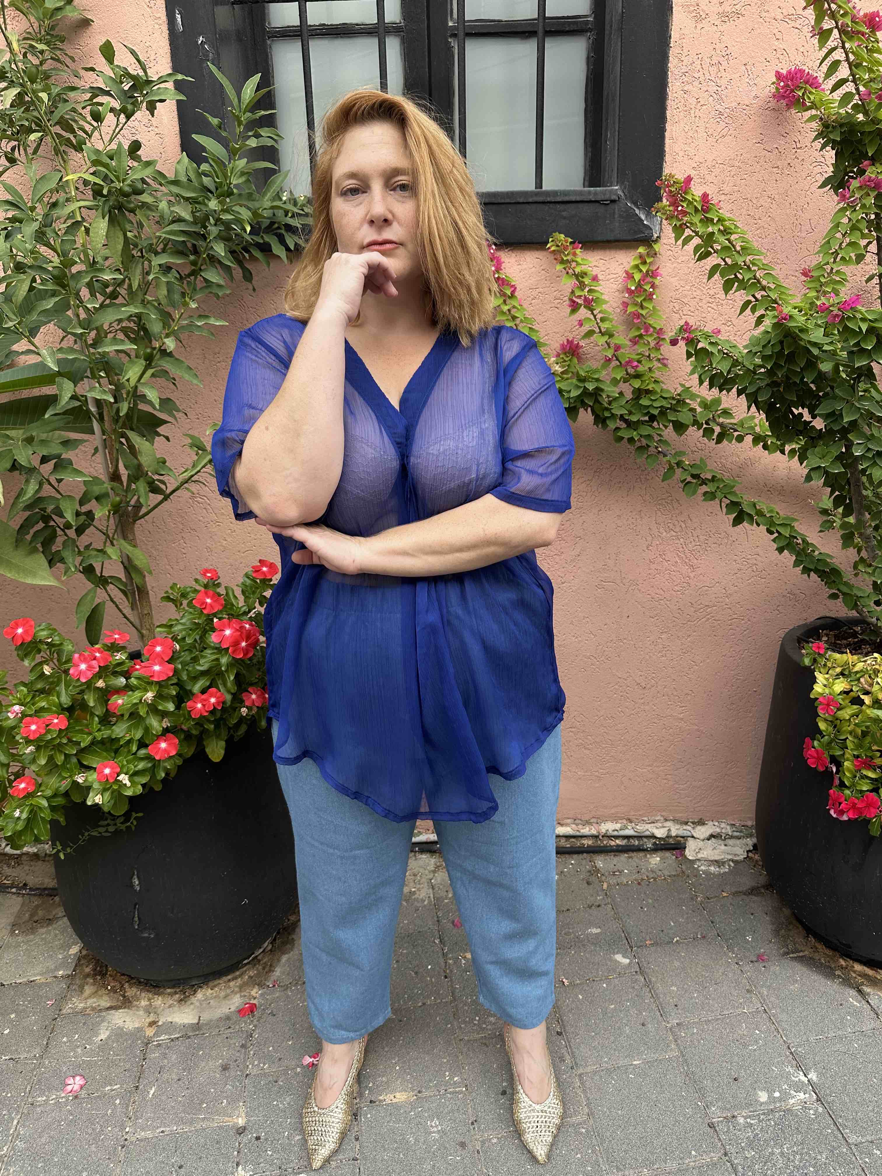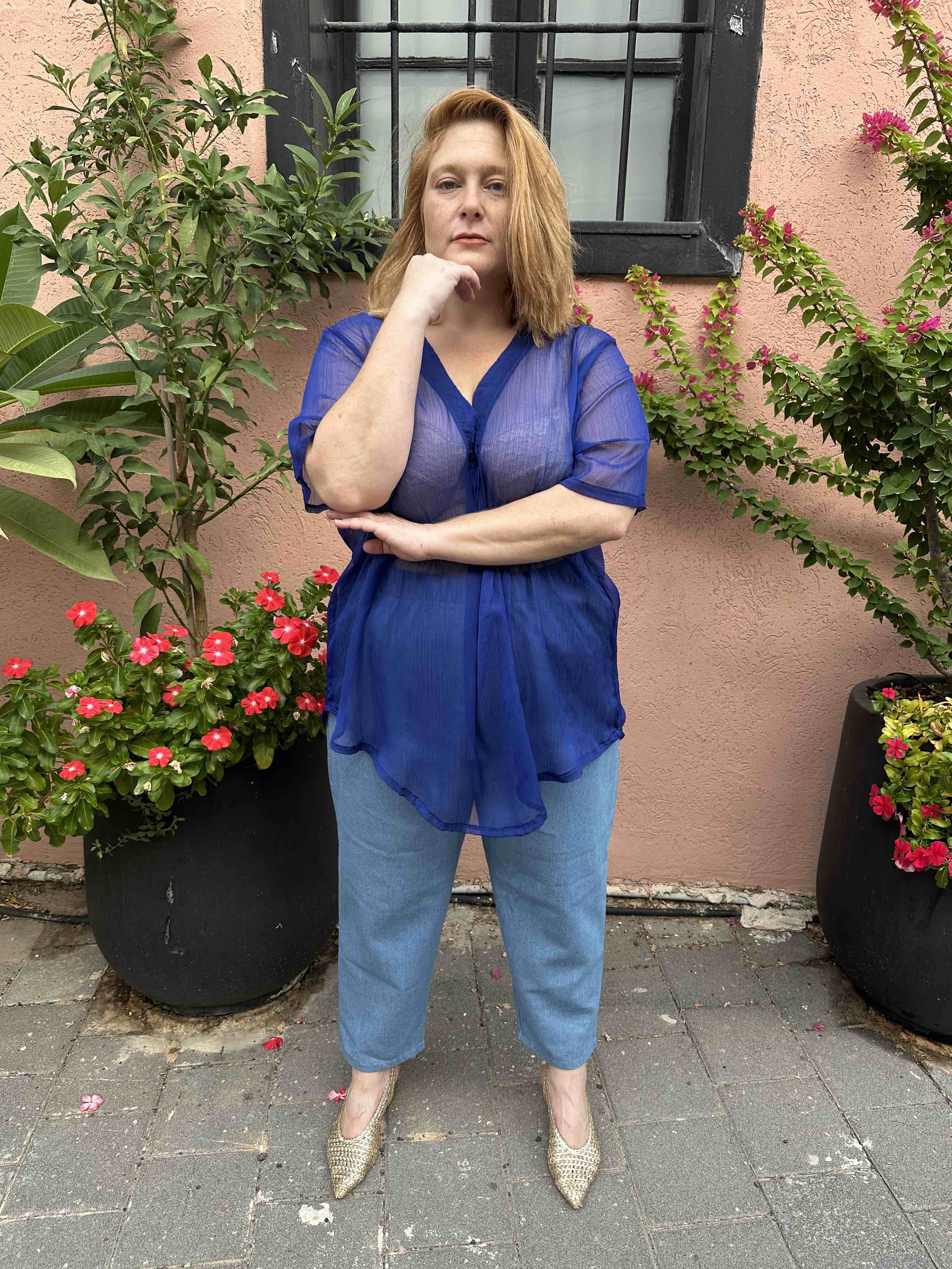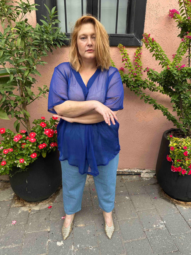 הדוגמנית בתמונת סטודיו לובשת מידה 44 וגובהה 1.60 מטר.