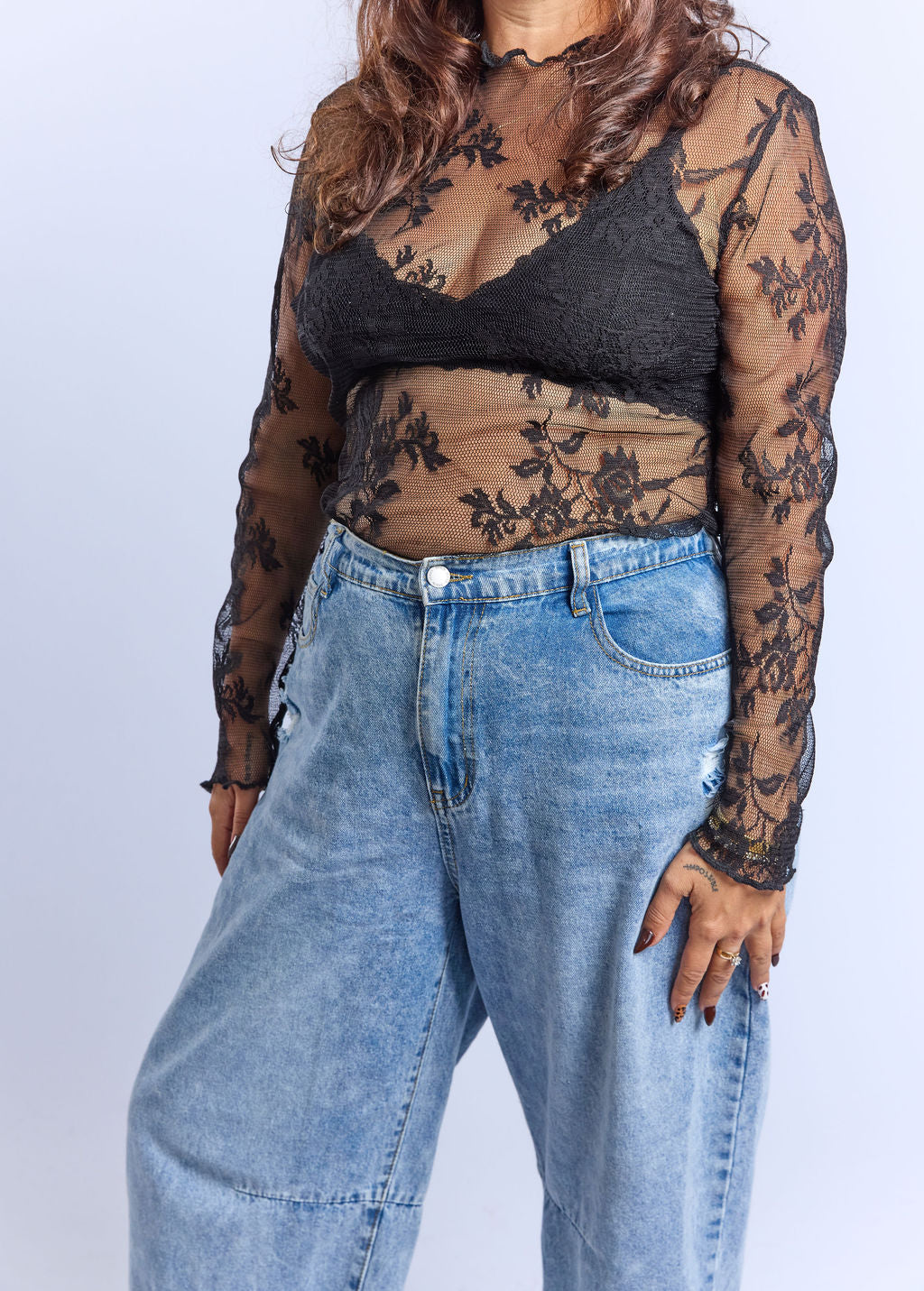 חולצת תחרה דקיקה ושקופה שתתאים למידות גדולות בגזרה צמודה עם צווארון עגול, שעולה מעט במעלה הצוואר, איך אינו גולף. החולצה מצריכה ללבוש תחתיה חזיה אטומה או טופ או גופיה לבחירתך.
