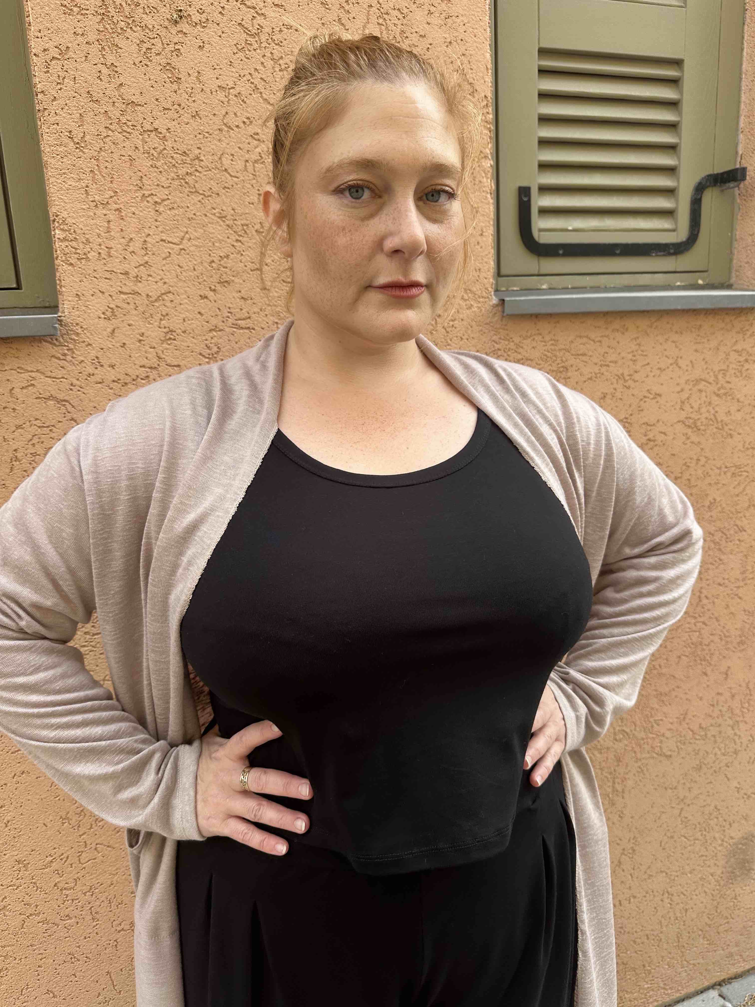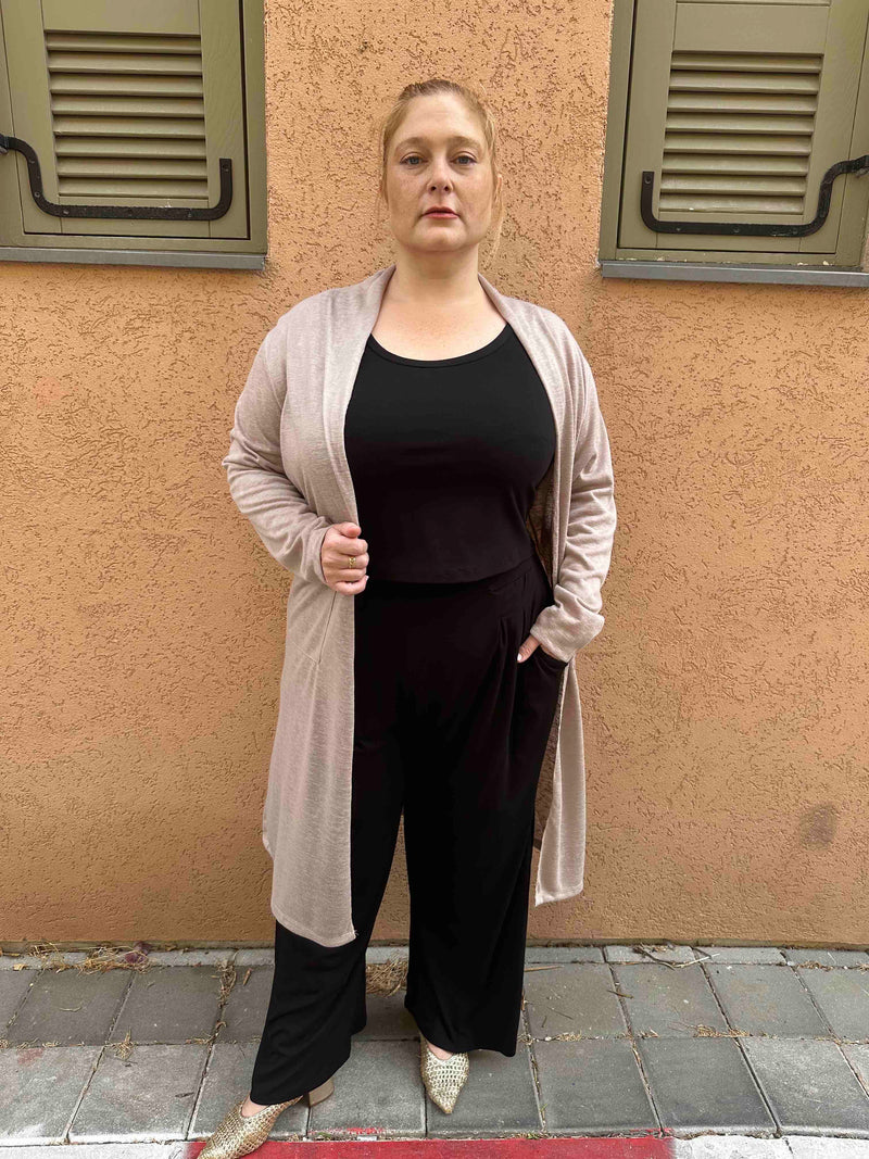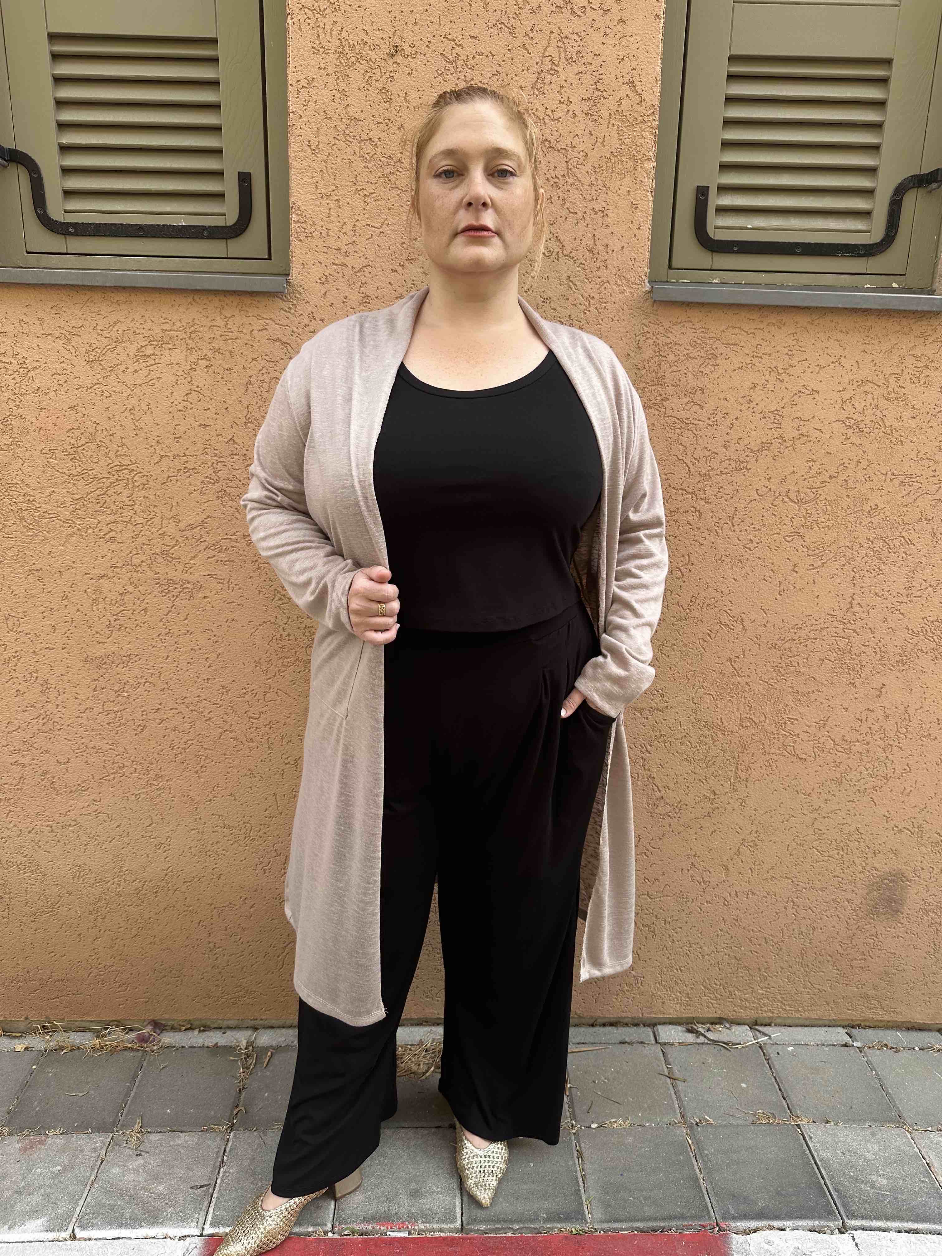 הדוגמנית בתמונת סטודיו לובשת מידה 44 וגובהה 1.60 מטר.