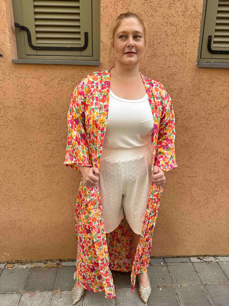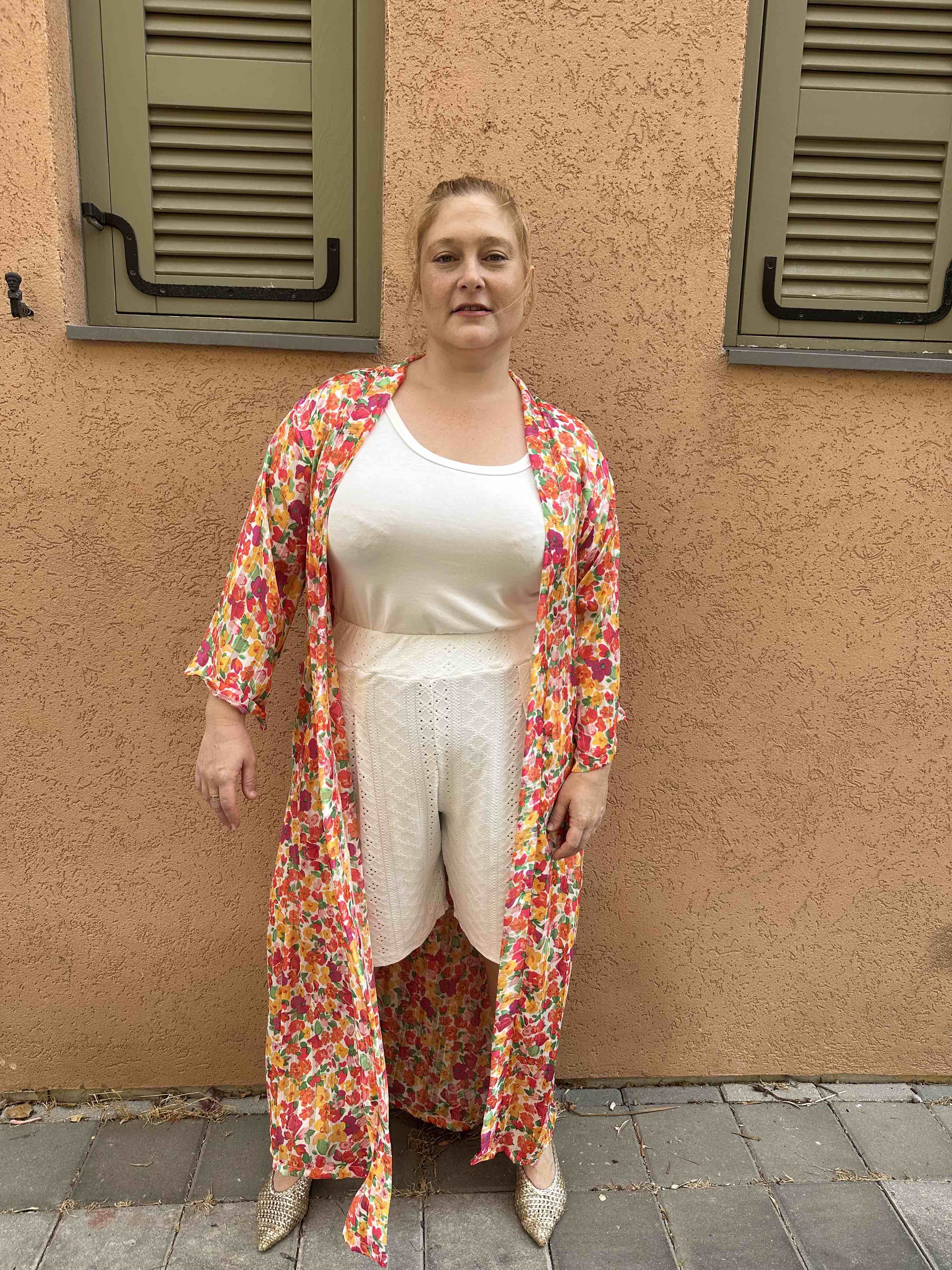 הדוגמנית בתמונה לובשת מידה 44 וגובהה 1.60 מטר, הקימונו יתאים למידות 38-48.