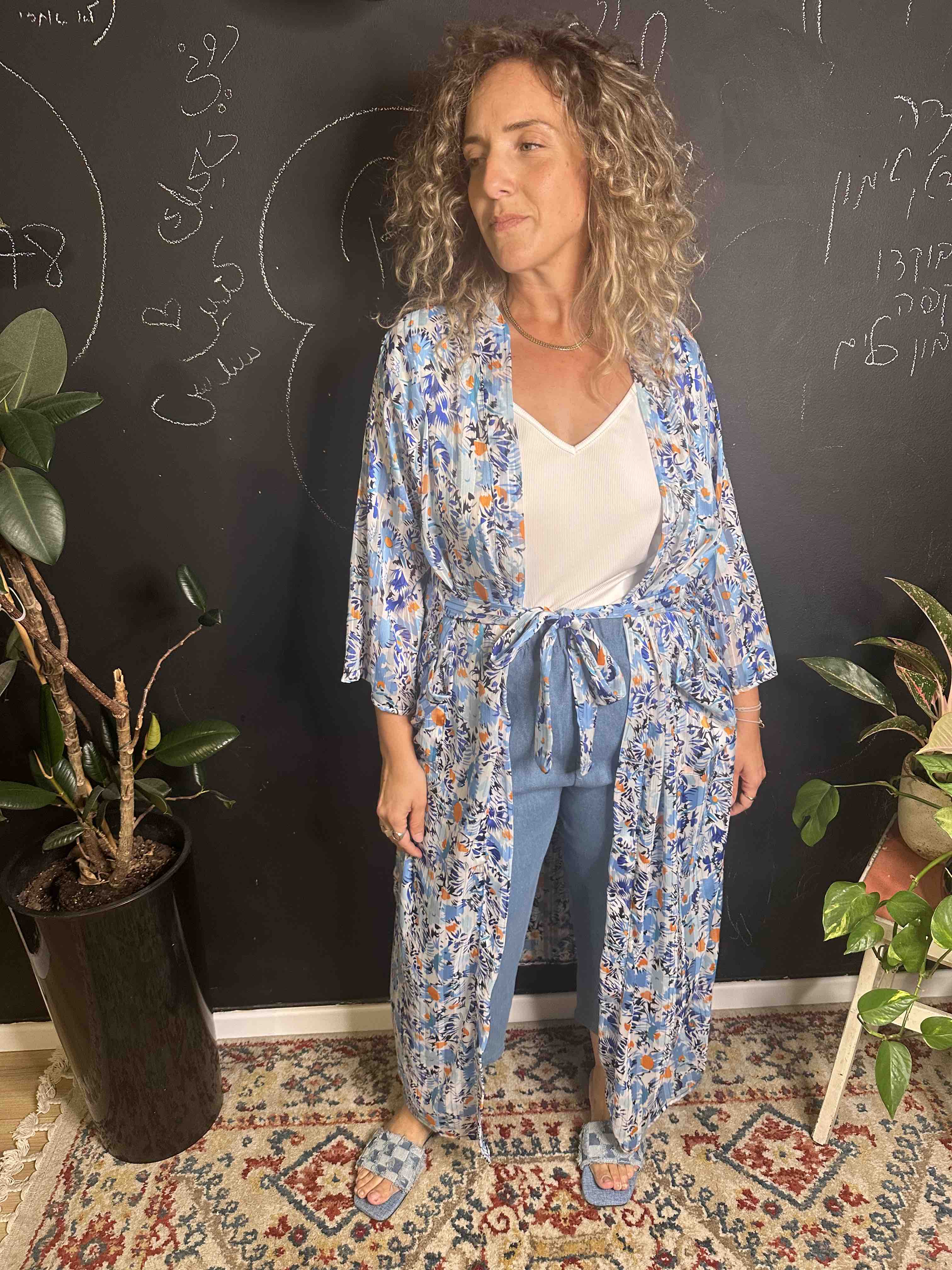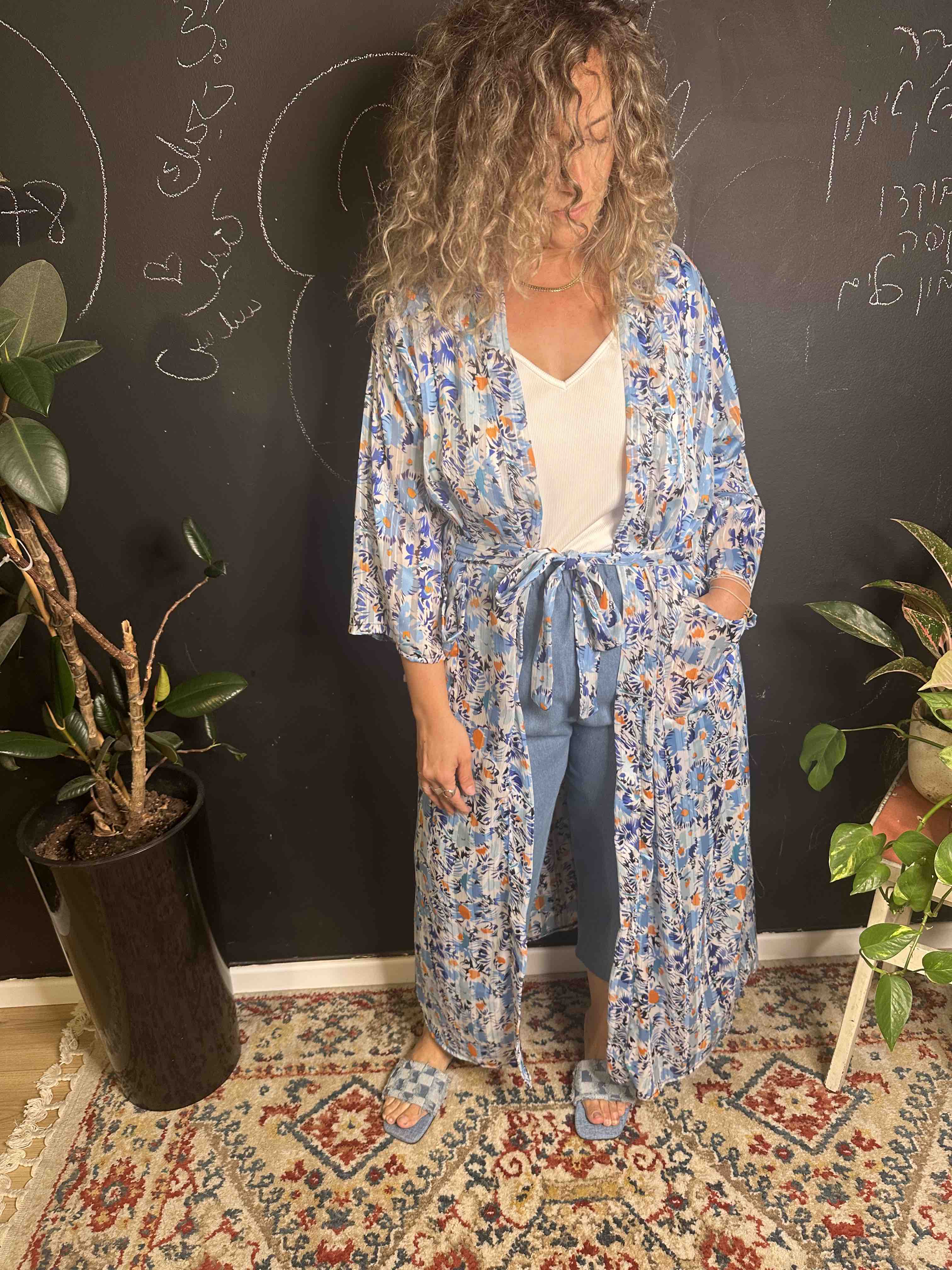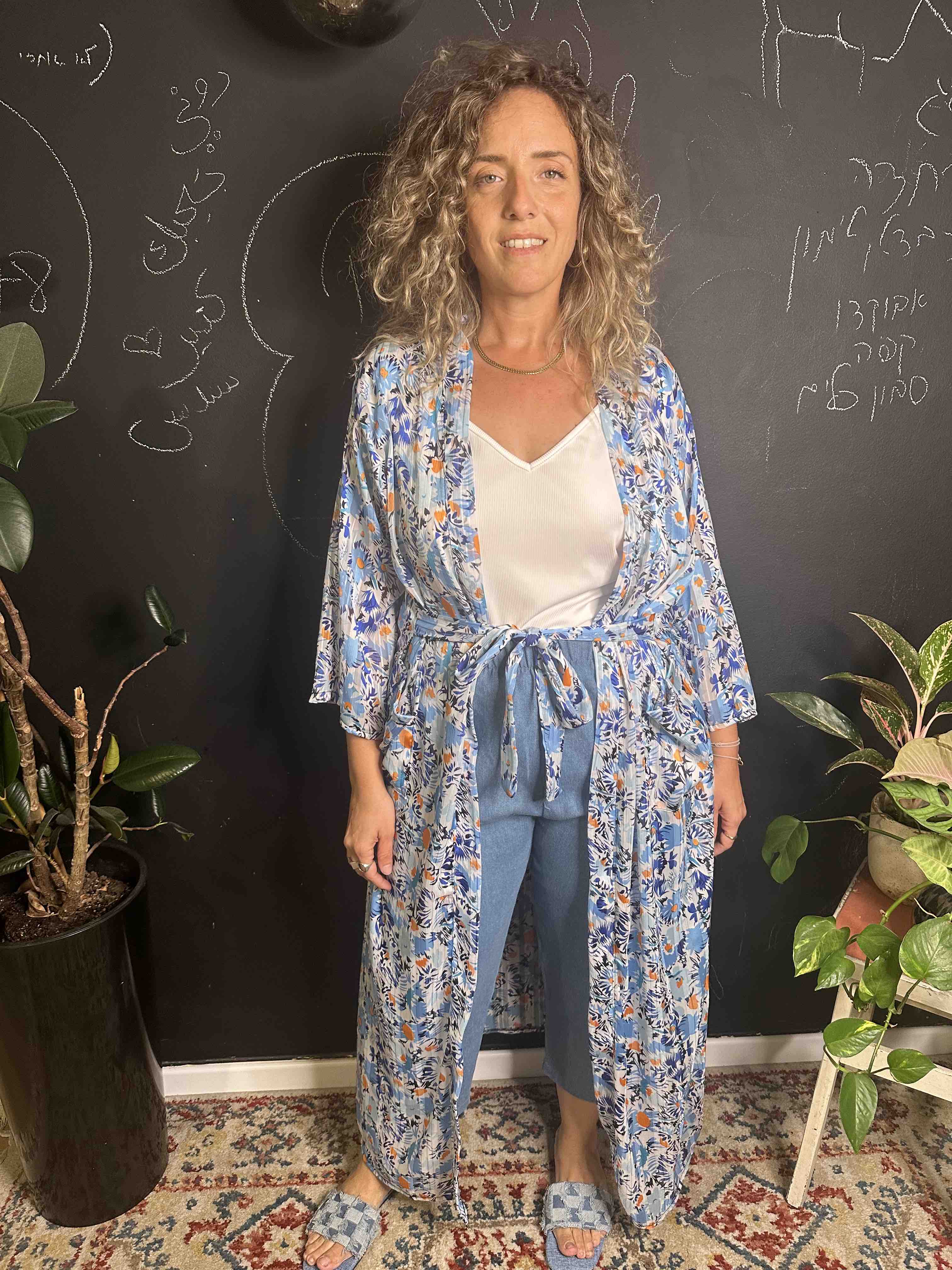 הדוגמנית בתמונת חוץ לובשת מידה 44 וגובהה 1.60 מטר, הקימונו יתאים למידות 38-48.