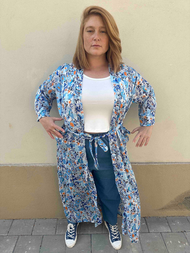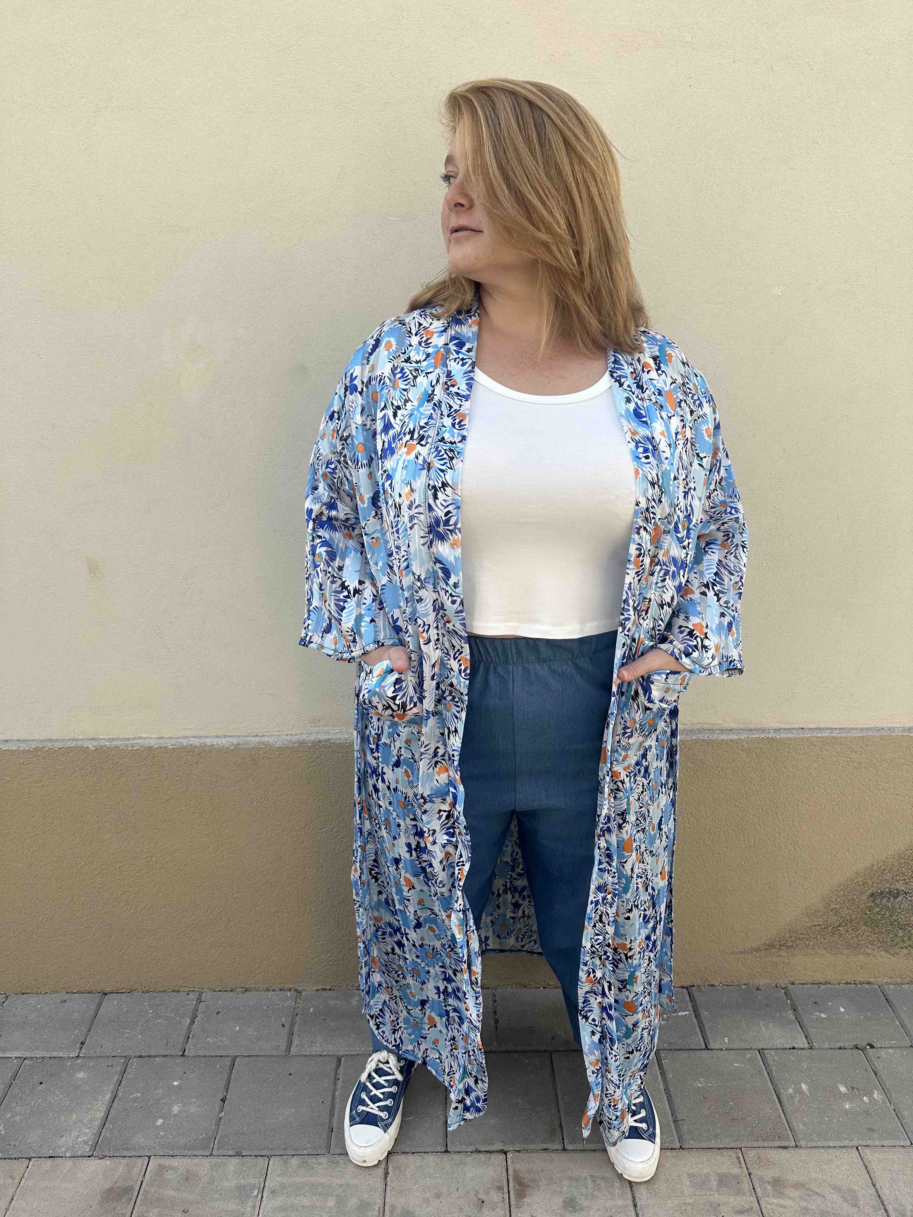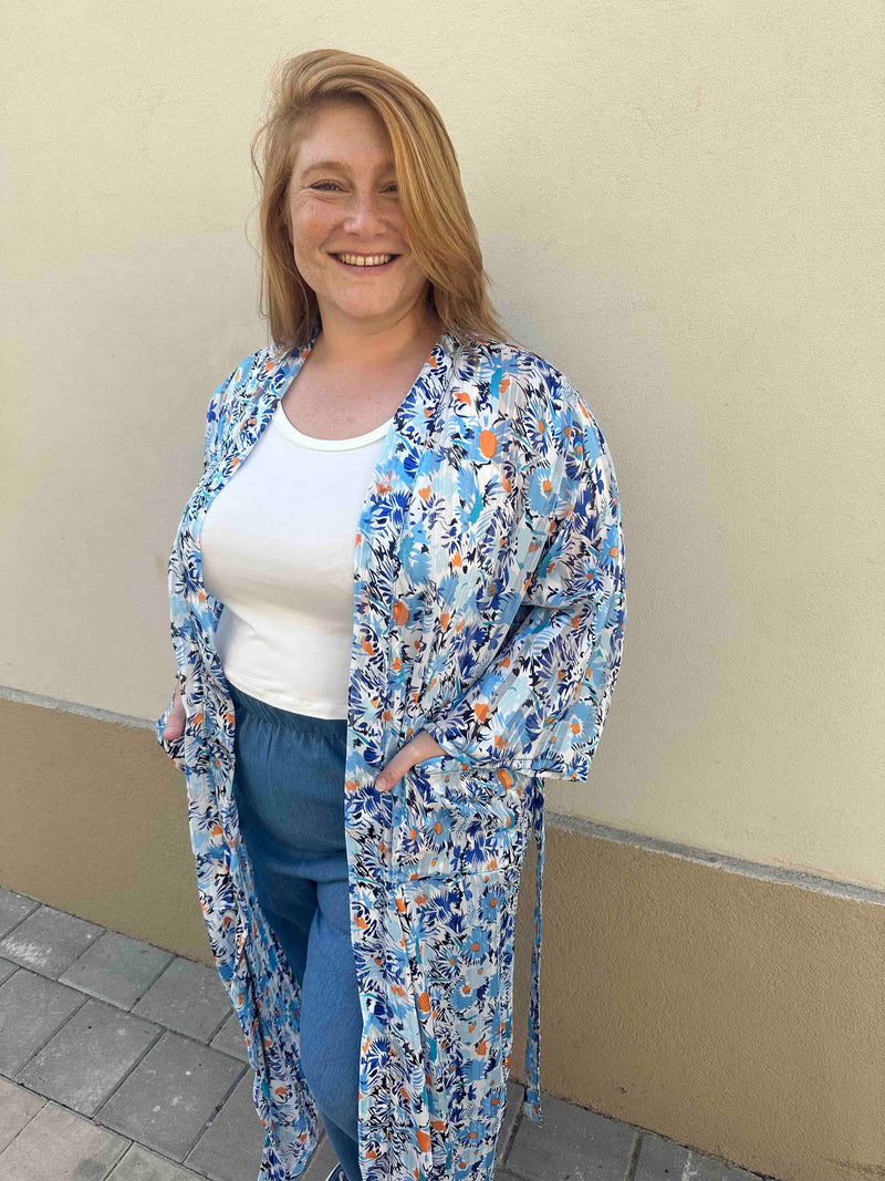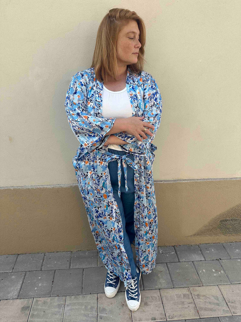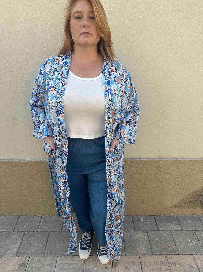 הדוגמנית בתמונה לובשת מידה 46 וגובהה 1.68 מטר, הקימונו יתאים למידות 38-48.