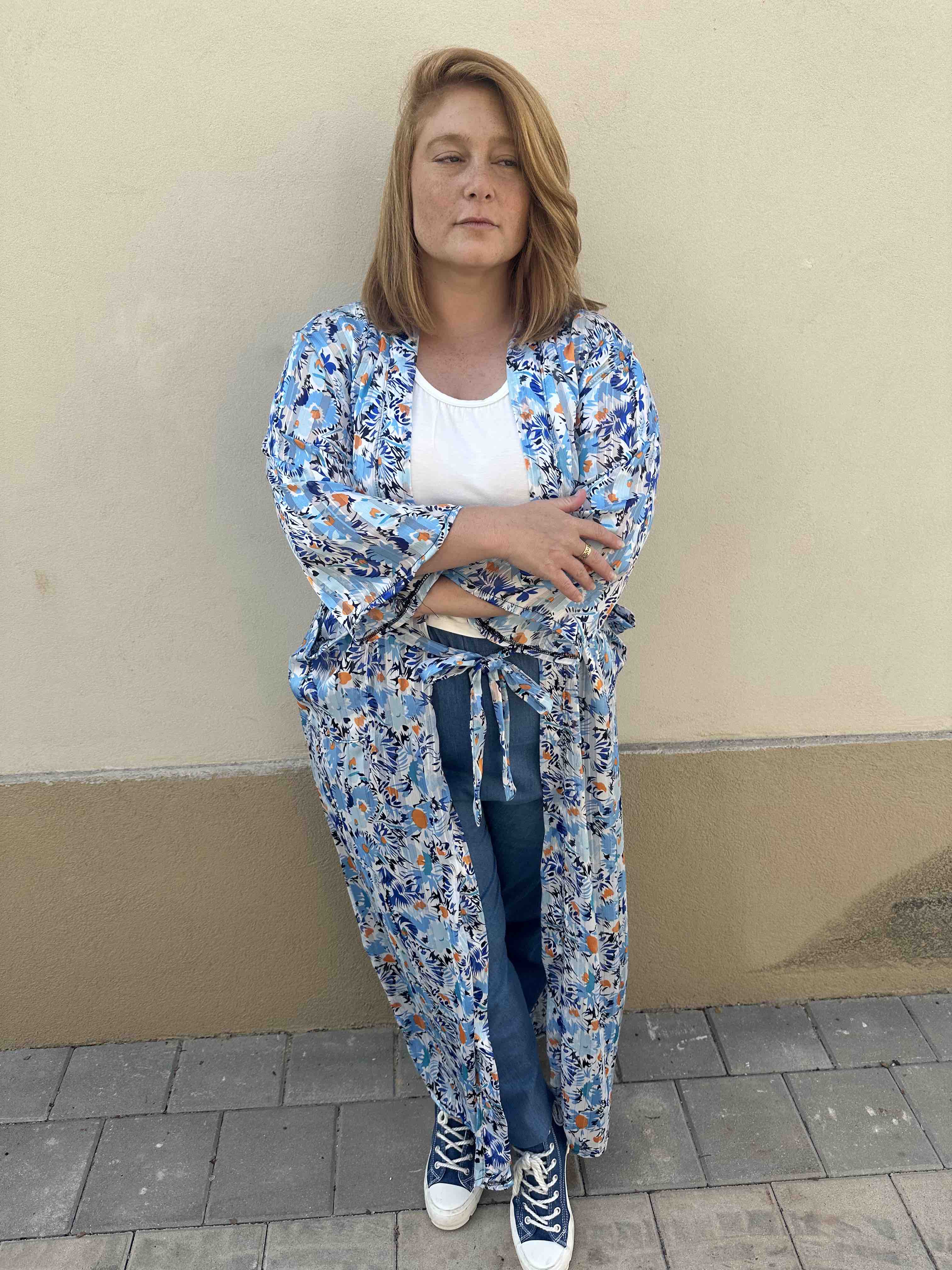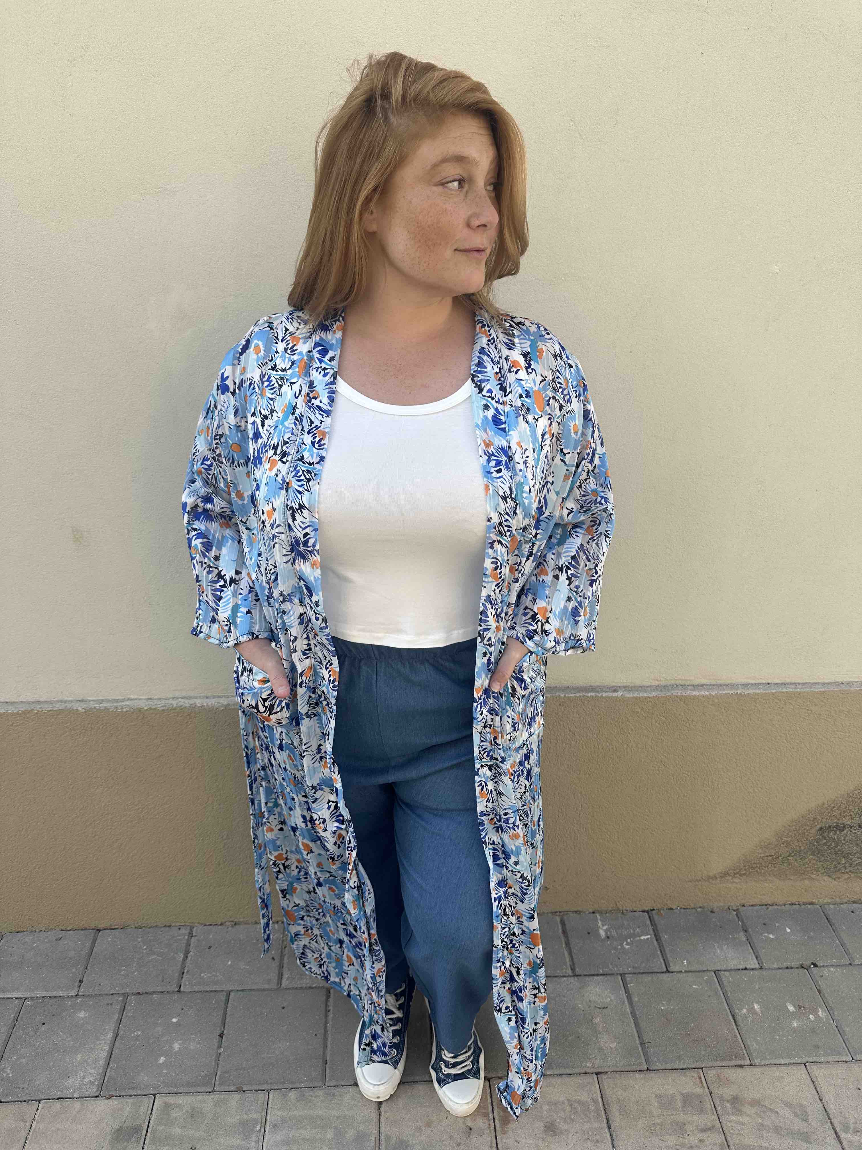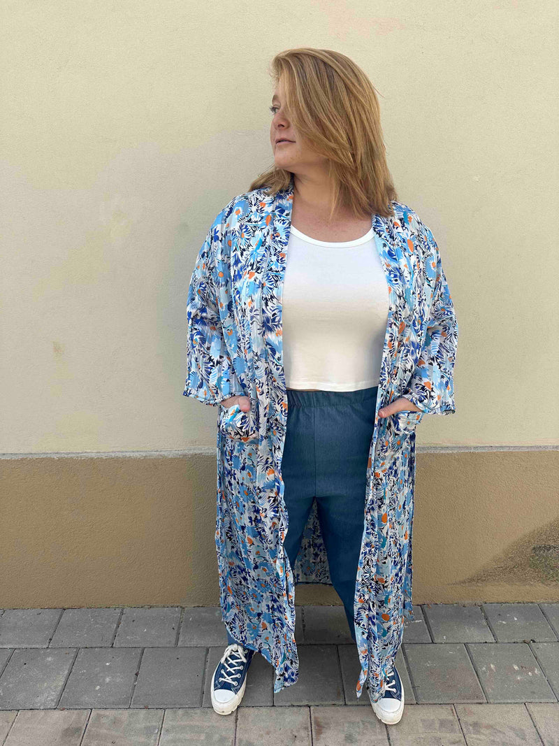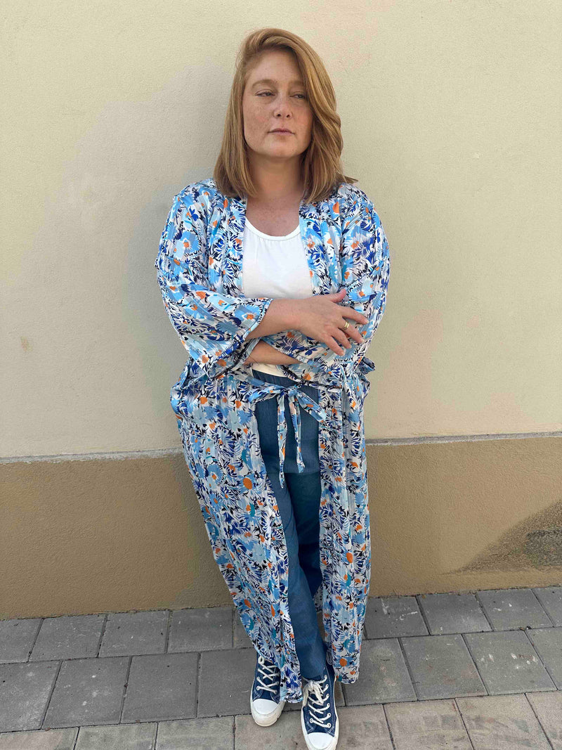 הדוגמנית בתמונה לובשת מידה 46 וגובהה 1.68 מטר, הקימונו יתאים למידות 38-48.