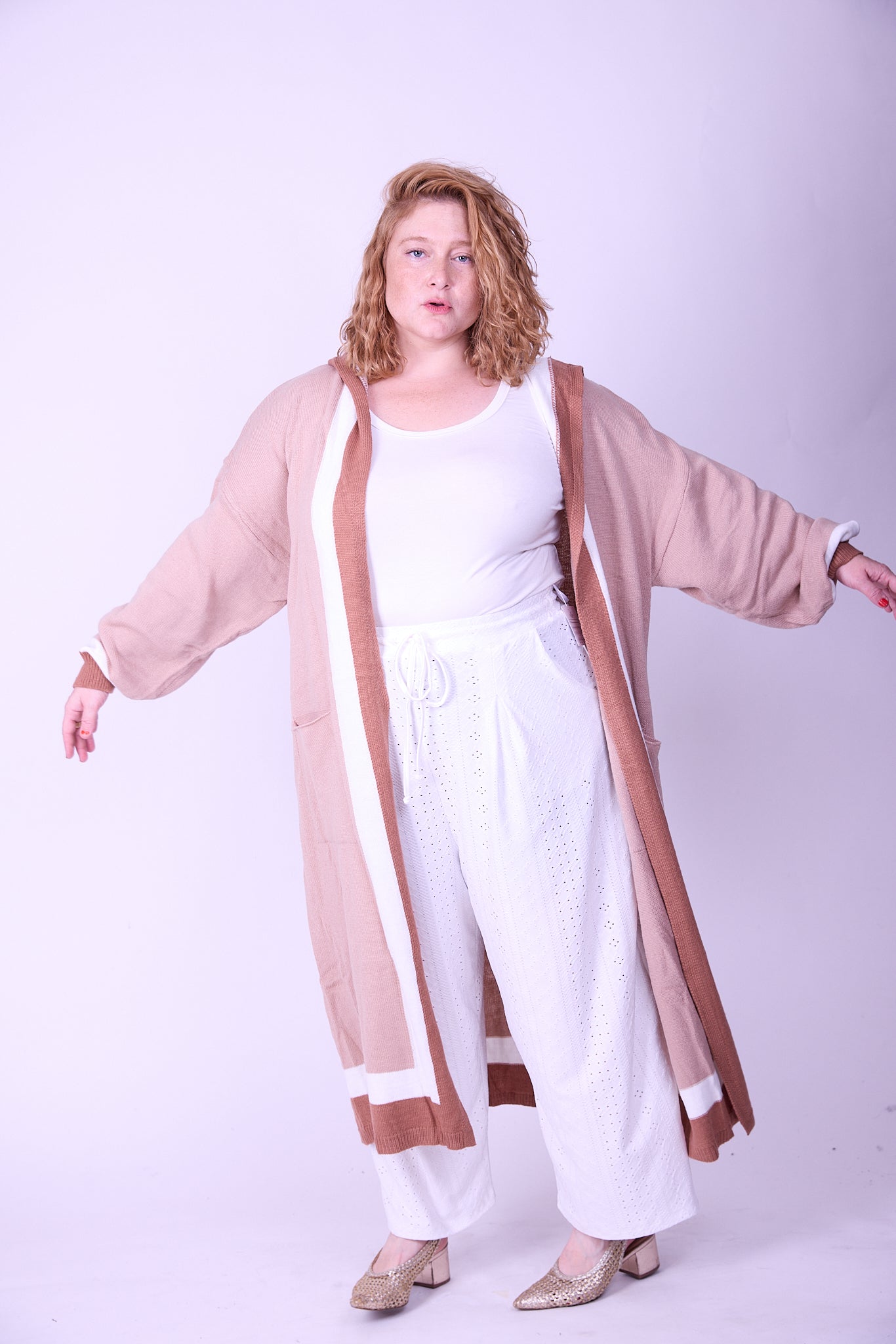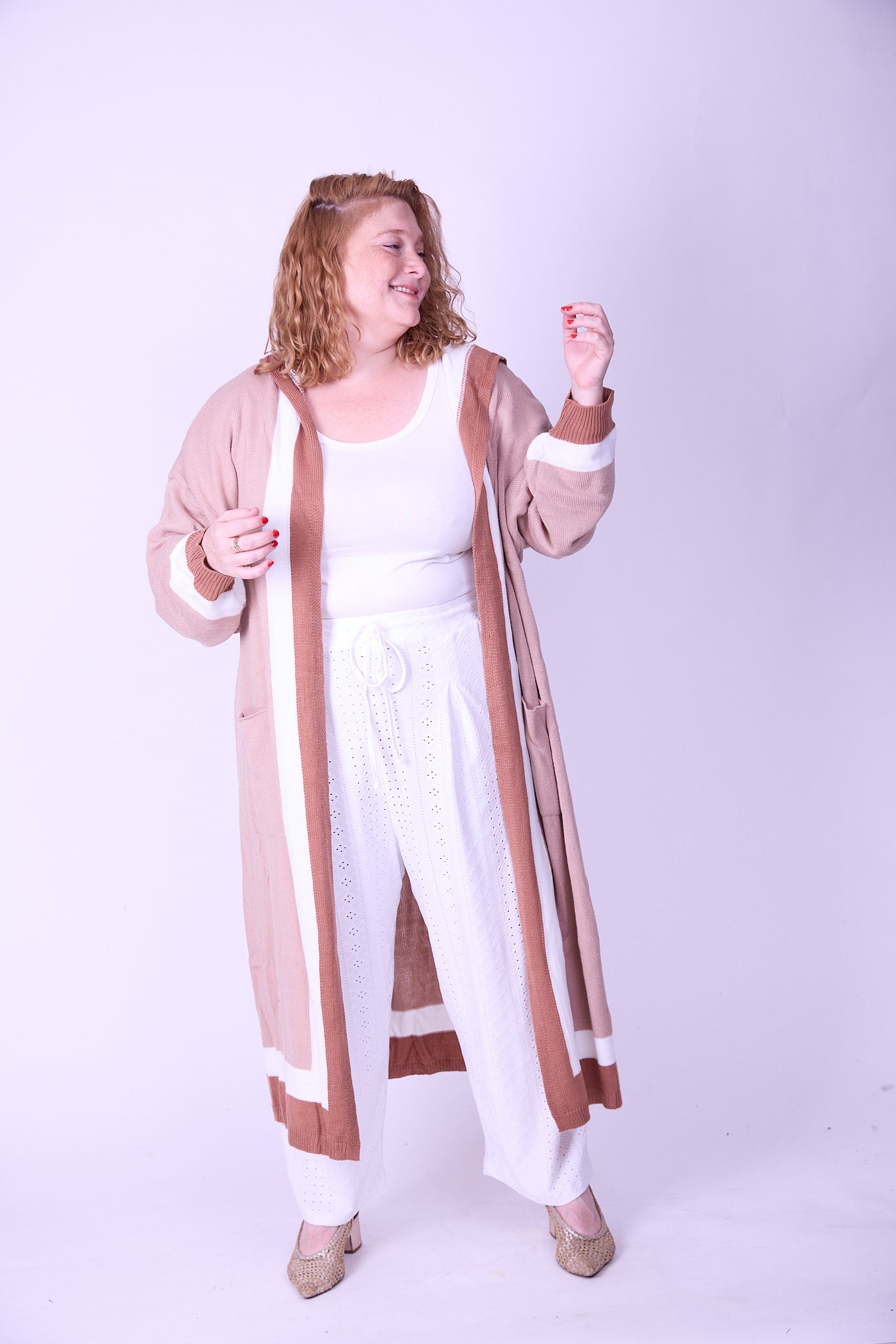 הדוגמנית בתמונת סטודיו לובשת מידה 44 וגובהה 1.60 מטר.