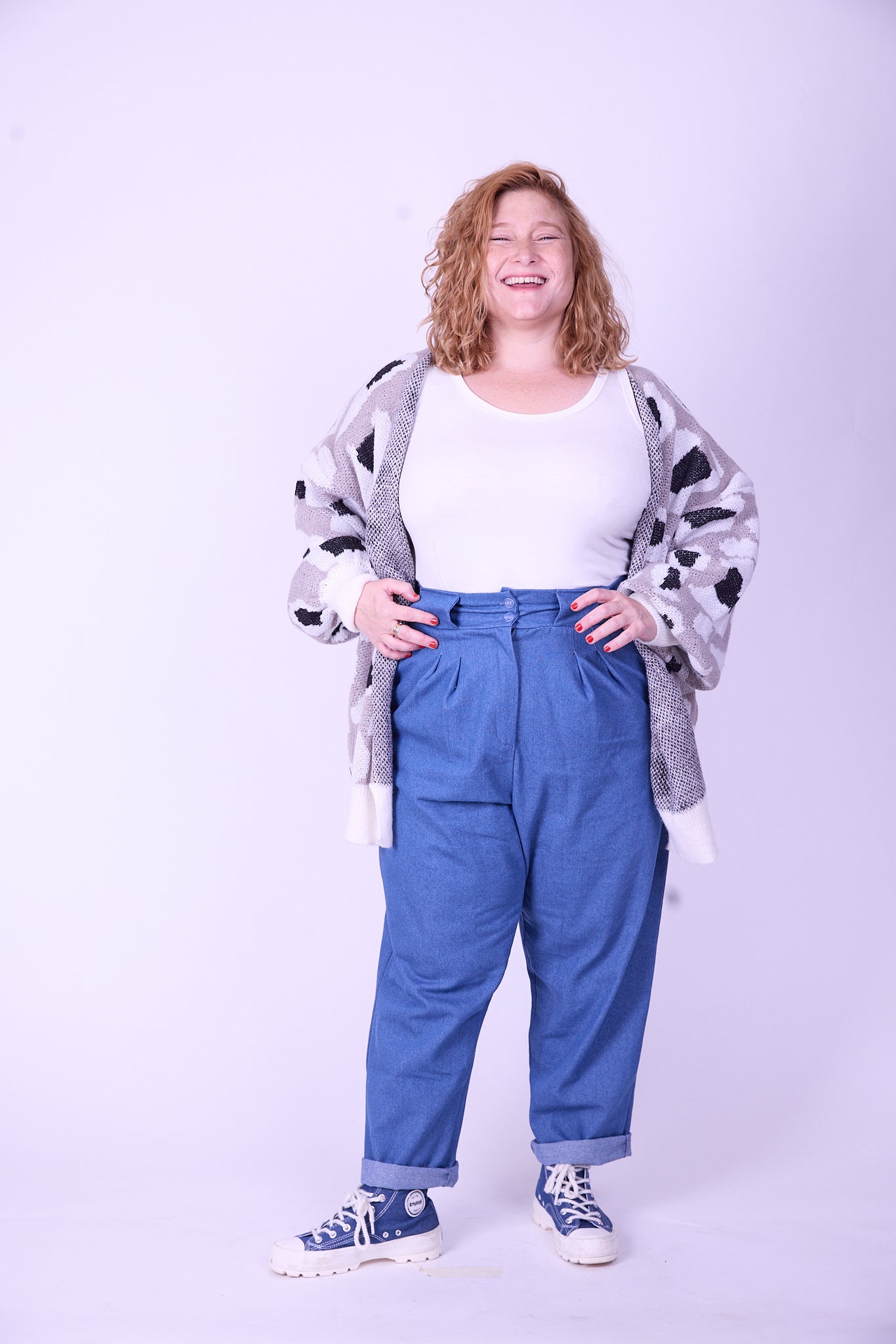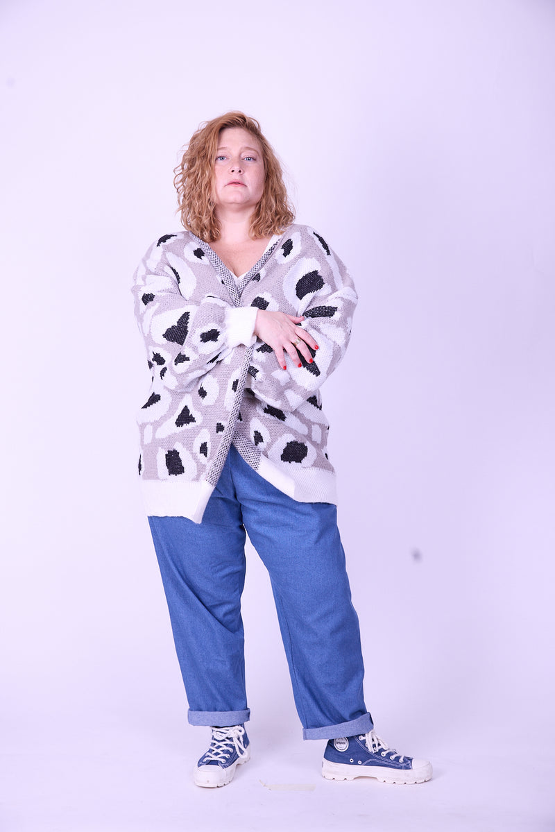 הדוגמנית בתמונת סטודיו לובשת מידה 44-46 וגובהה 1.60 מטר.