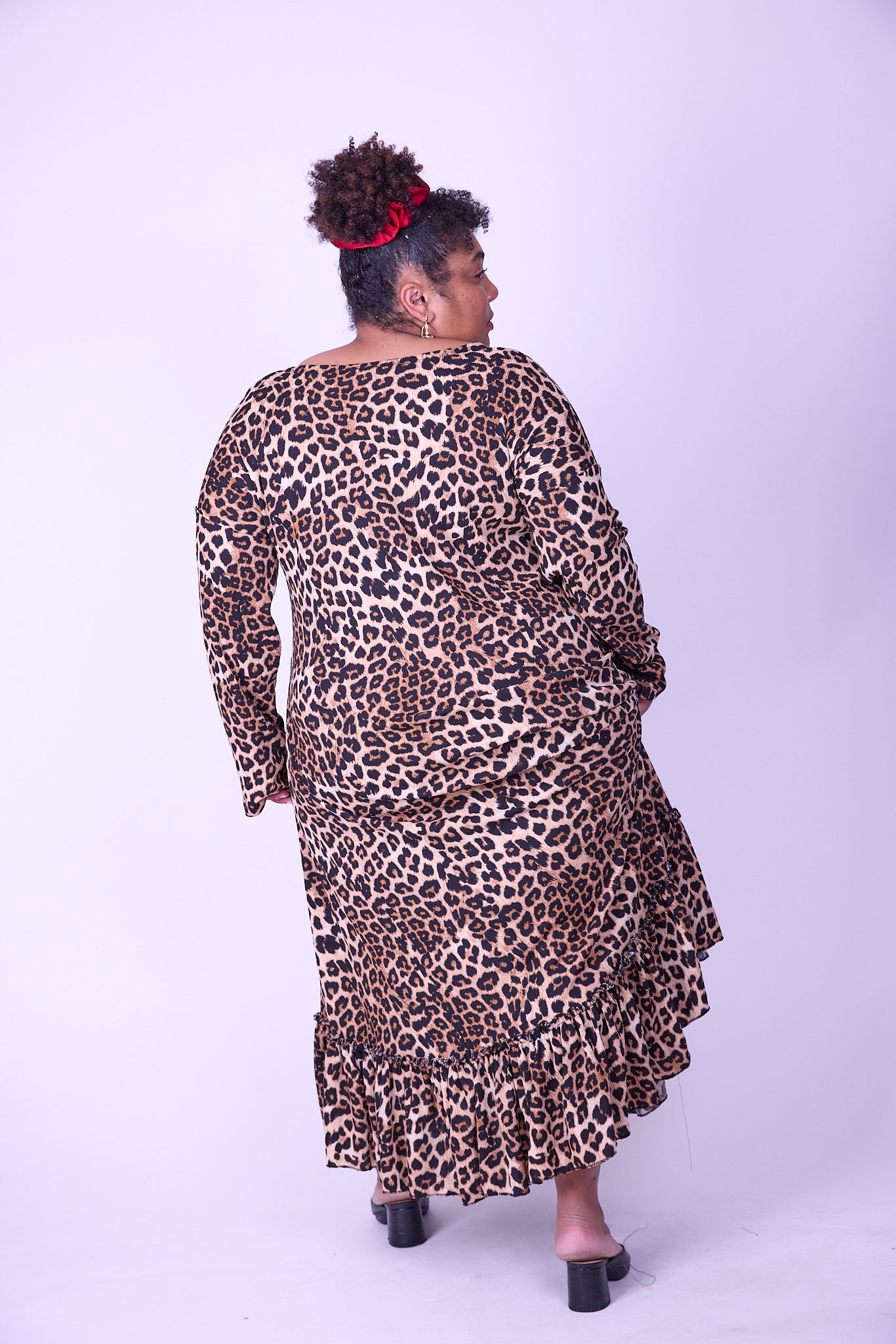 שמלה בגזרת אוברסייז עם כיסים ומלמלה בקצה.