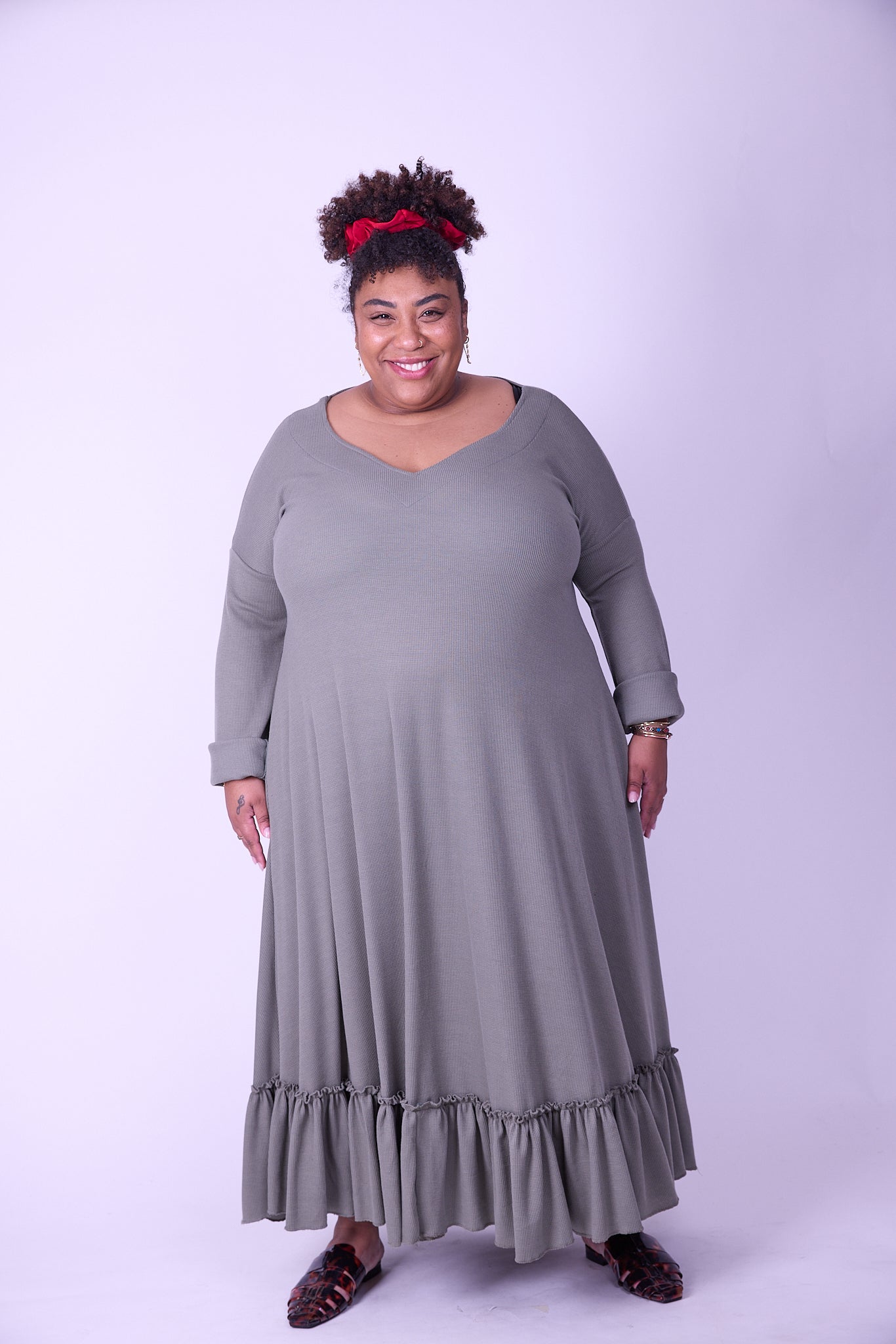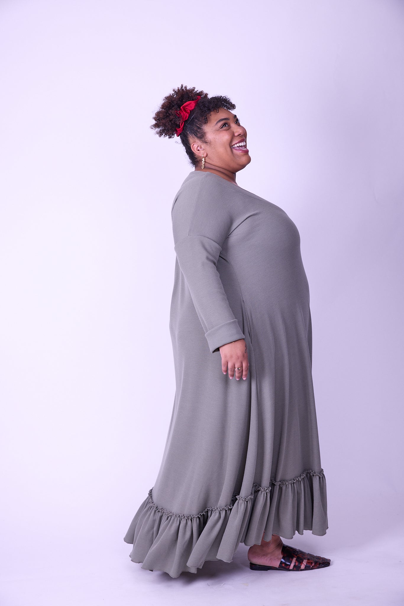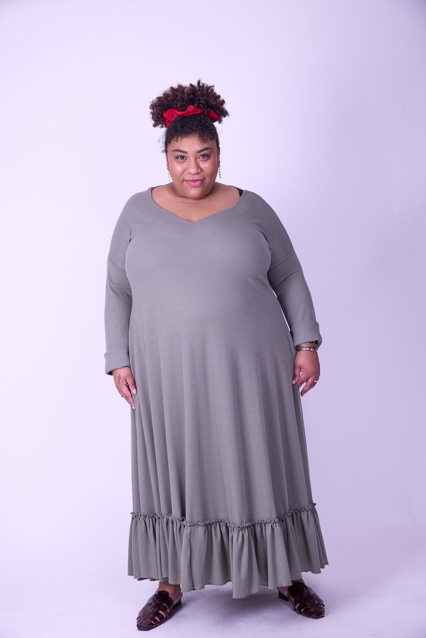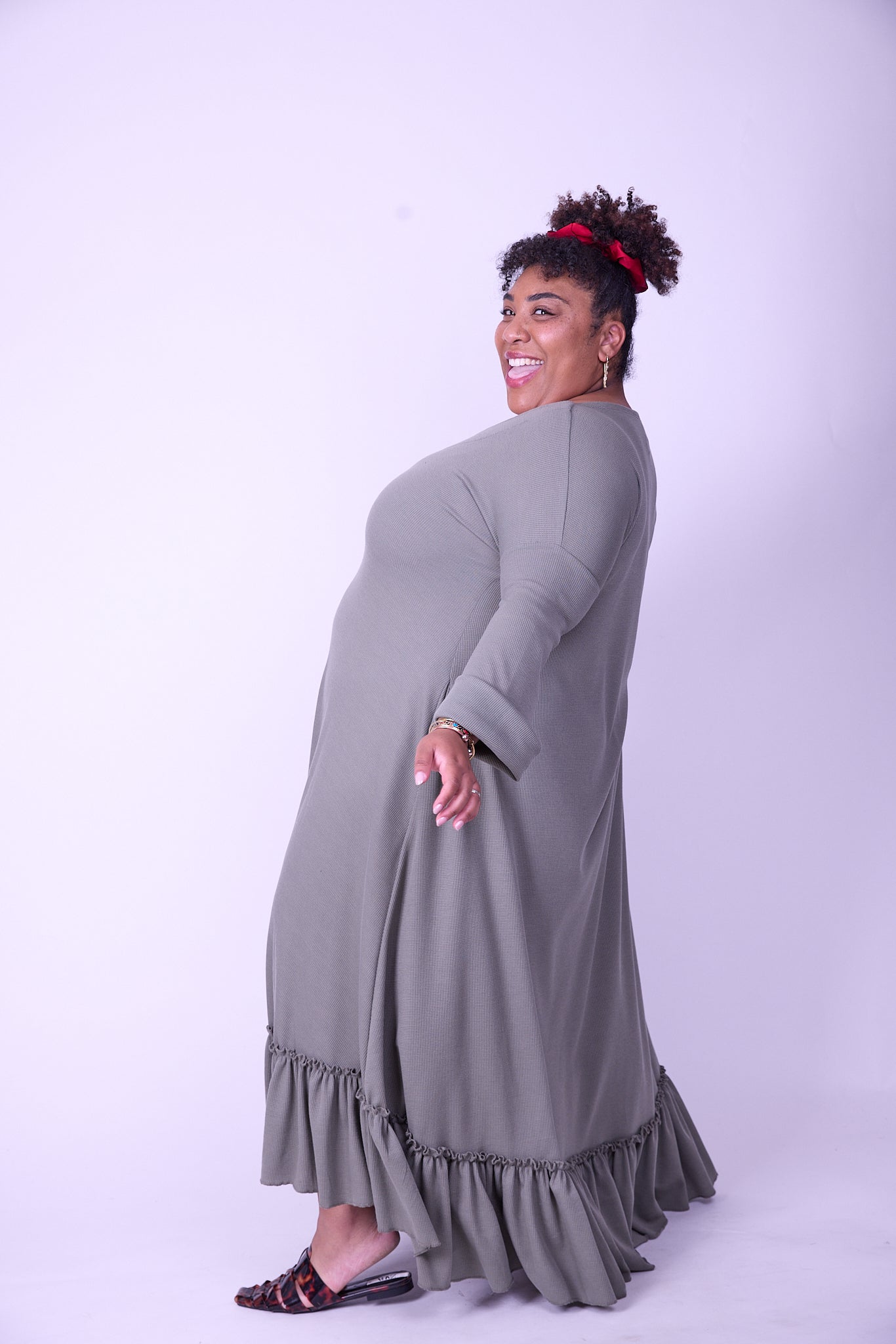 שמלה בגזרת אוברסייז עם כיסים ומלמלה בקצה.