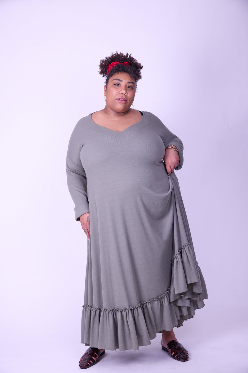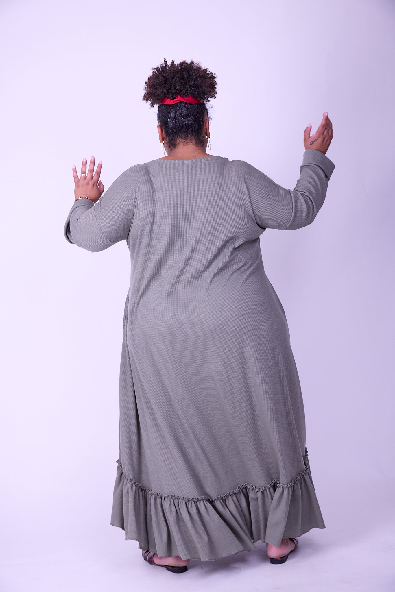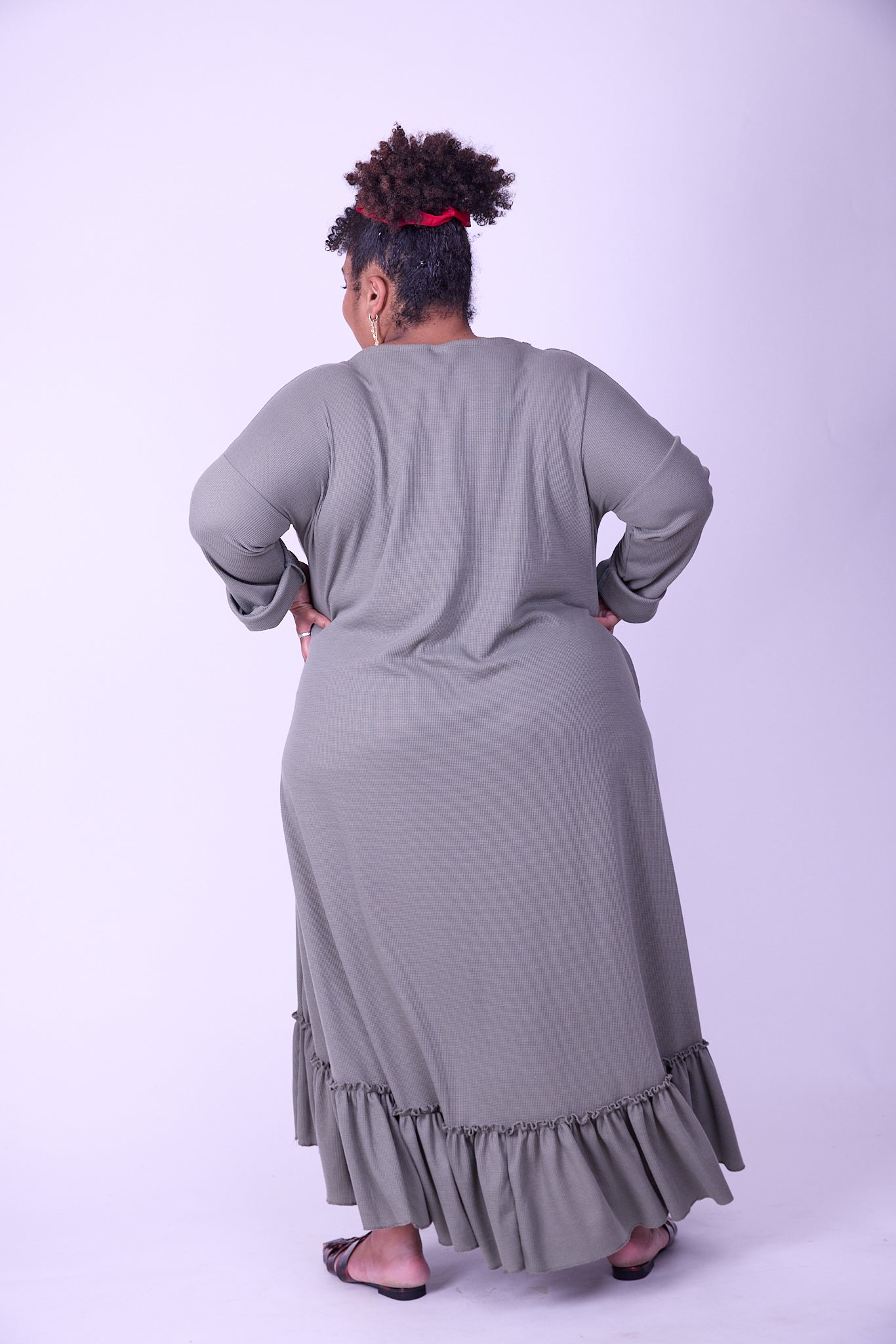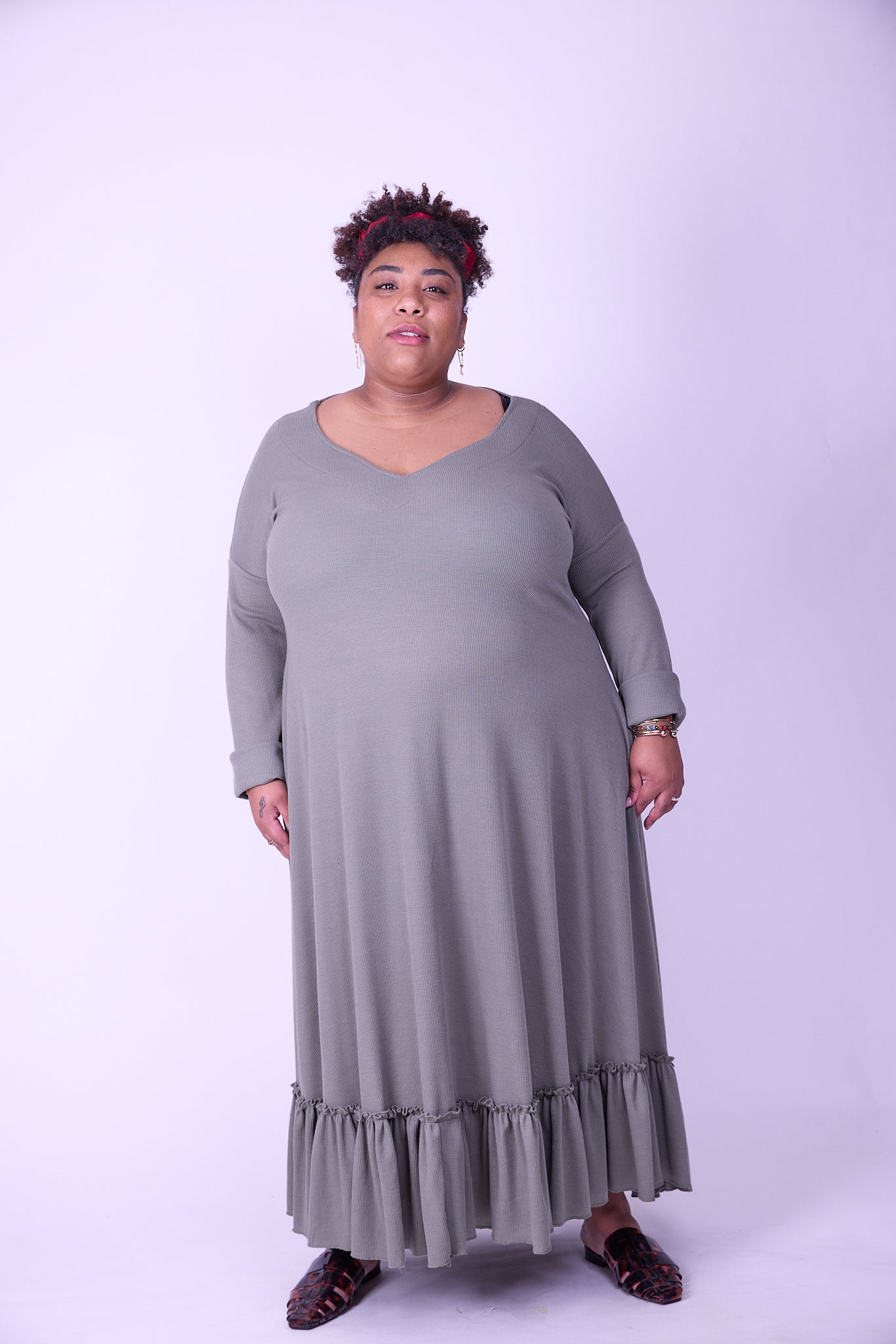 שמלה בגזרת אוברסייז עם כיסים ומלמלה בקצה.
