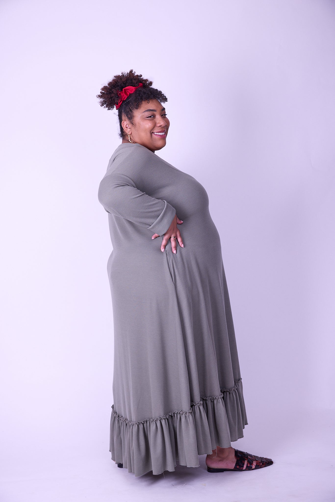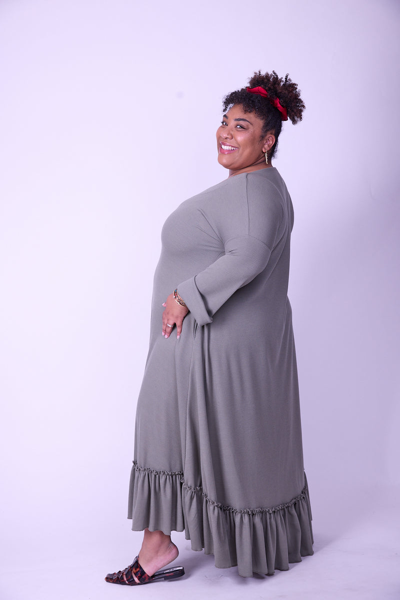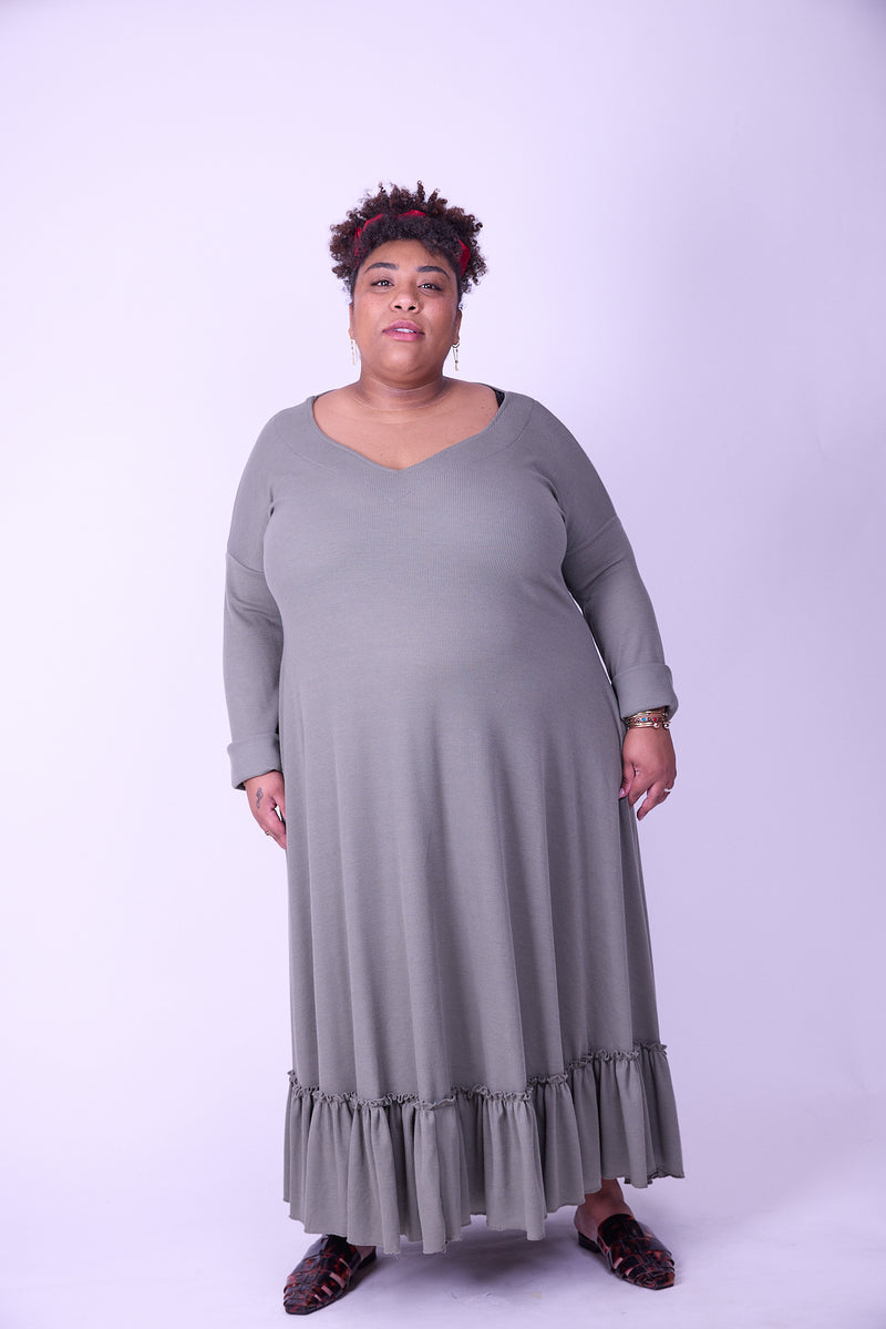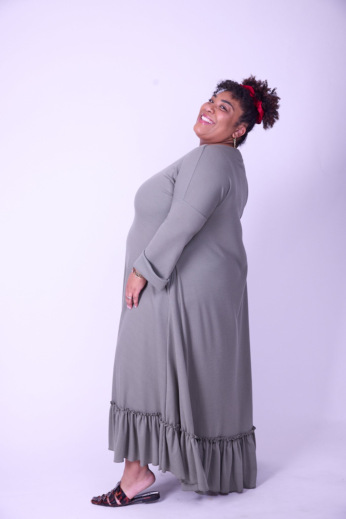 שמלה בגזרת אוברסייז עם כיסים ומלמלה בקצה.