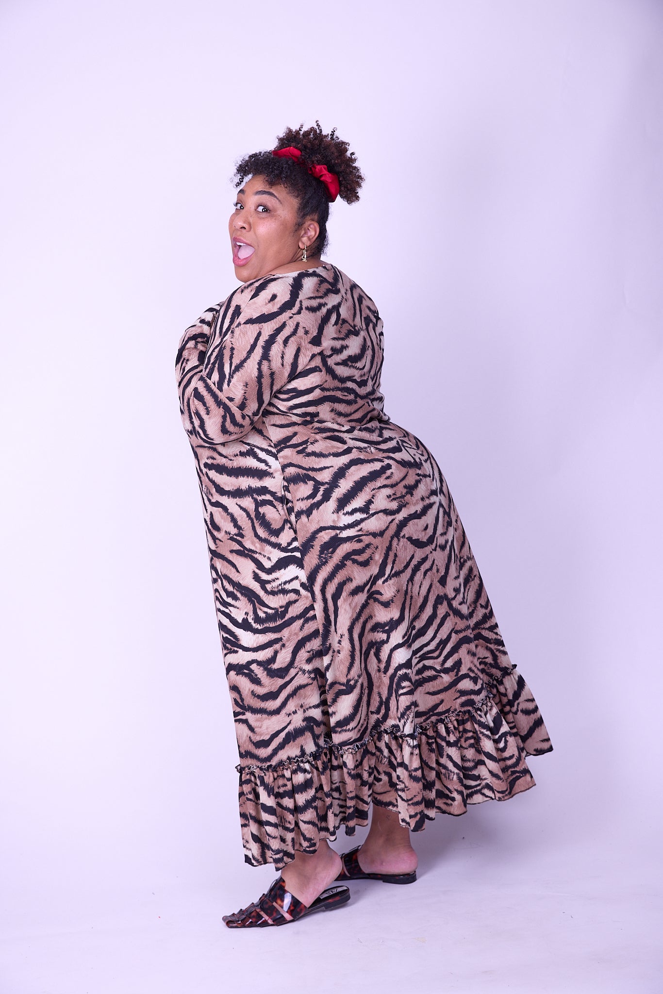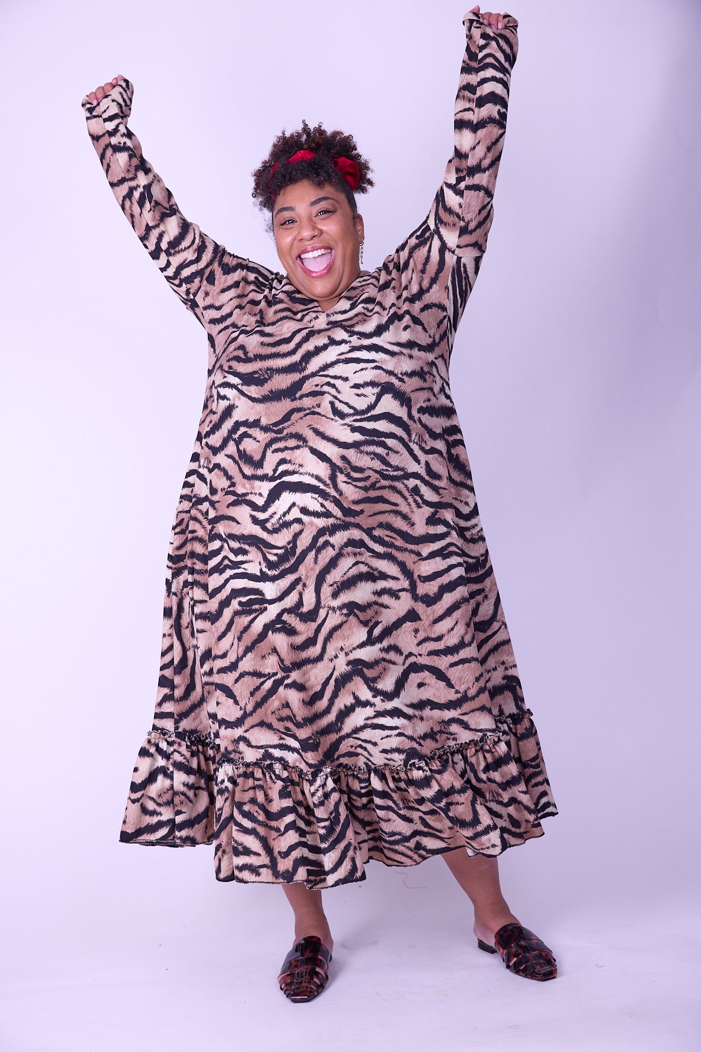 שמלה בגזרת אוברסייז עם כיסים ומלמלה בקצה.