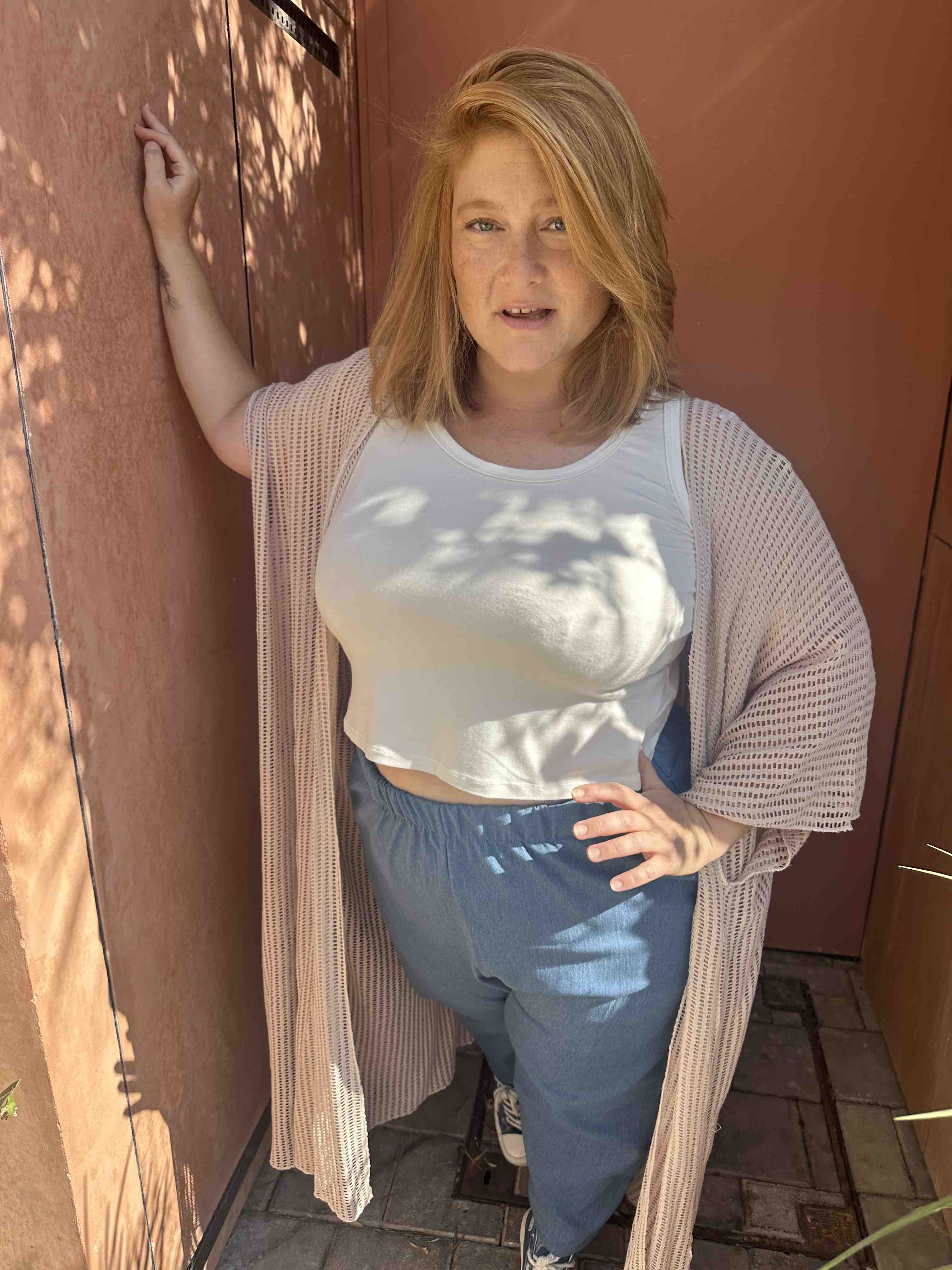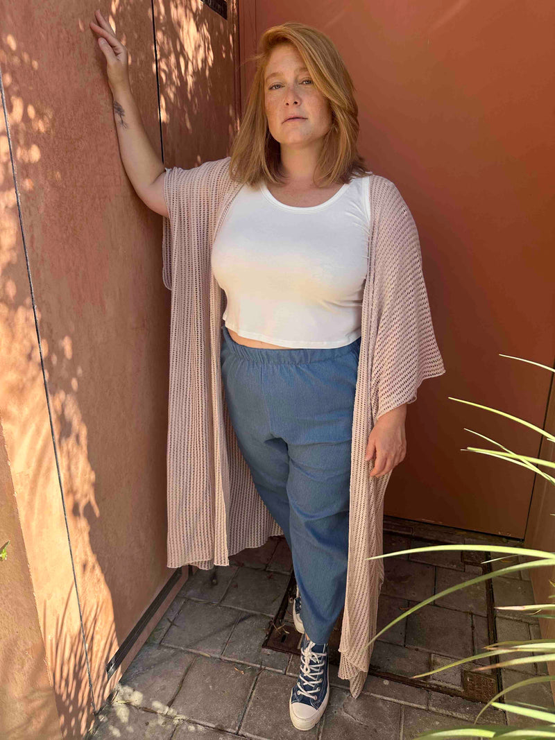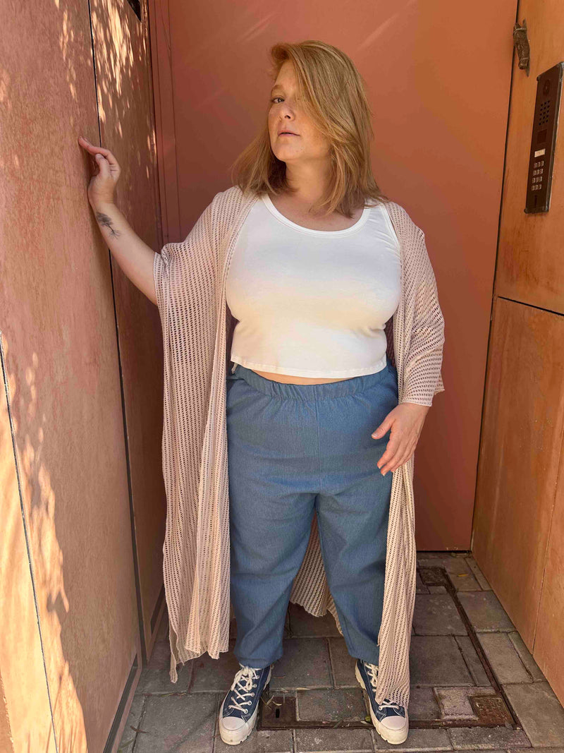 הדוגמנית בתמונה לובשת מידה 46-48 וגובהה 1.67 מטר.